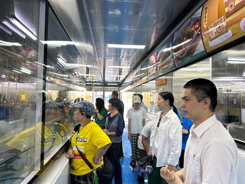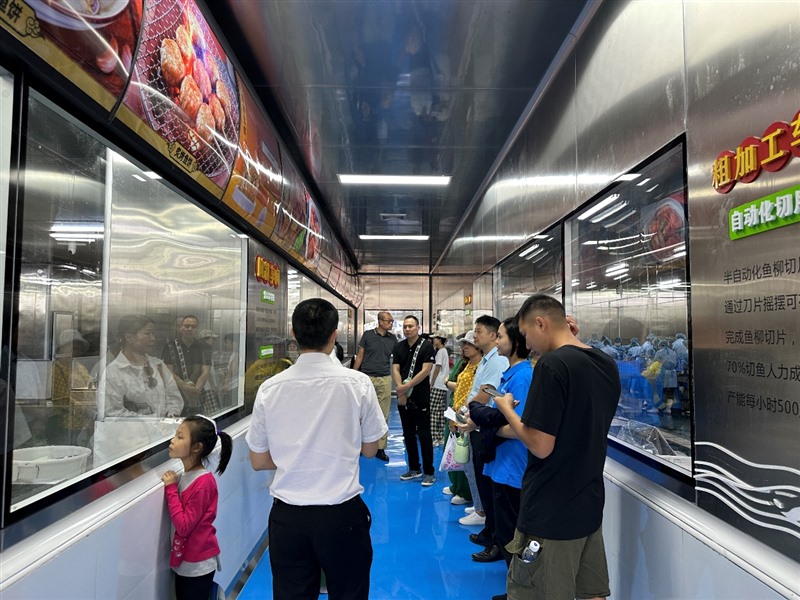 在预制菜智造中心,工作人员向大家介绍了如何通过智能化、自动化的生产设备,实现水产品的规模化、标准化加工生产。中心内展示的技术和设备引起了一行人的浓厚兴趣,积极向工作人员询问各种问题,了解水产品加工的相关知识。