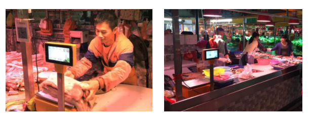 智慧菜菜市场平台统一使用肉菜通计价秤,该秤是我公司专门为智慧菜市场研发的一款集产品溯源、称重、交易、统计和结算等于一体的智能称重设备。它在传统秤置零、 去皮、校秤的基础上增加了保存菜价、身份证支付、肉菜通支付、移动支付等多种支付方式。